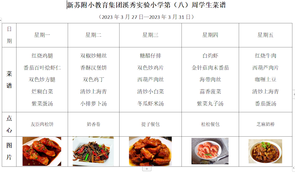 新苏附小教育集团溪秀实验小学2022-2023学年第二学期第(八)周学生菜谱